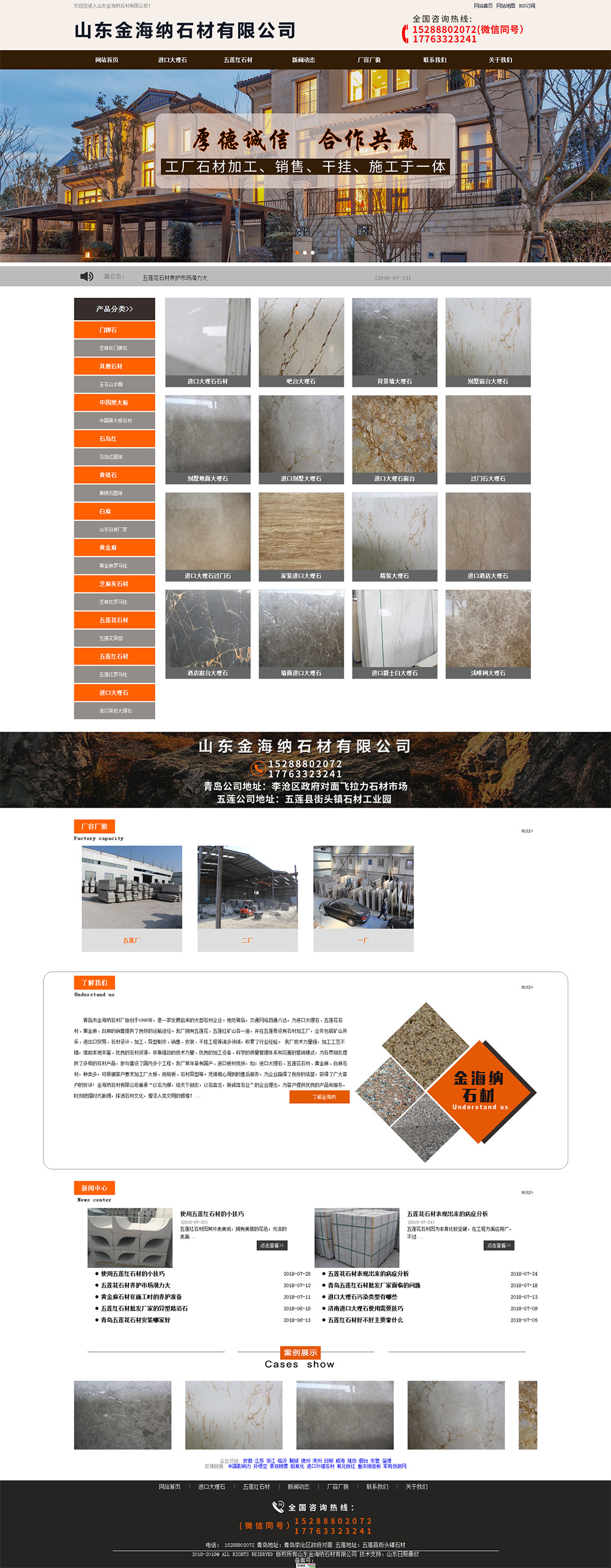 • 青島市金海納石材廠始 創(chuàng)于1998年,是一家發(fā)展起來的大型石材企業(yè)。地處青島,交通網(wǎng)絡(luò)四通八達(dá),為進(jìn) 口大理石、五蓮花石材、黃金麻、白麻的銷售提供了良好的運輸途徑。我廠擁 有五蓮花、五蓮紅礦山各一座,并在五蓮縣設(shè)有石材加工廠,業(yè)務(wù)包括礦山開采、進(jìn)出口貿(mào)易、石材設(shè)計、加工、異型制作、銷售、安裝、干掛工程等諸多領(lǐng)域,積累了行業(yè)經(jīng)驗。 我廠技 術(shù)力量強,加工工藝不錯,借助本地優(yōu)良的石材資源,依靠強勁的技 術(shù)力量、優(yōu)良的加工設(shè)備、科學(xué)的質(zhì)量管理體系和完善的營銷模式,為各界朋友提供了多樣的石材產(chǎn)品,參與建設(shè)了國